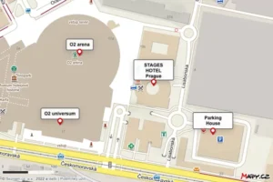 To reach the parking garage, follow Českomoravská Street. At house number Českomoravská 1181/21, turn into Lisabonská Street. After a few meters, you’ll encounter a roundabout—take the first exit to the right, and you’ll arrive at the parking garage. O2 arena and O2 universum are just a few minutes’ walk away.
